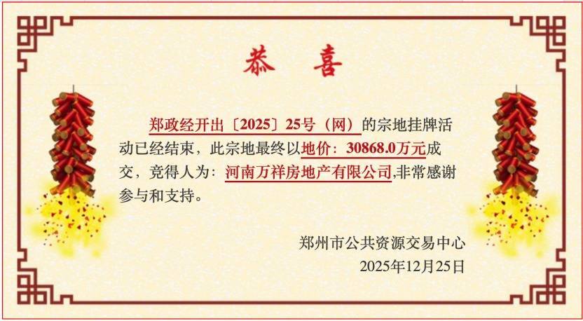 其中,编号为郑政经开出〔2025〕25号(网)的地块由河南万祥房地产有限公司以底价30868万元摘得。