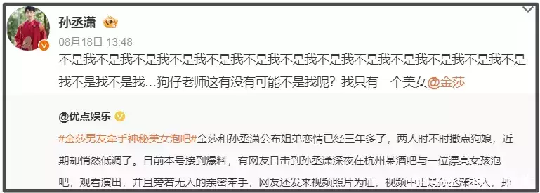 但在2025年仍是有了危急,孙丞潇被曝“酒吧牵手”。娱记拍到酷似孙丞潇的须眉更阑在杭州某酒吧与一位漂亮女孩泡吧,俩东谈主还亲密牵手。随后,孙丞潇转发否定是视频中的须眉,并艾特金莎承诺“我唯唯一个好意思女”。金莎也积极转发互动,否定视频中的须眉是男友。