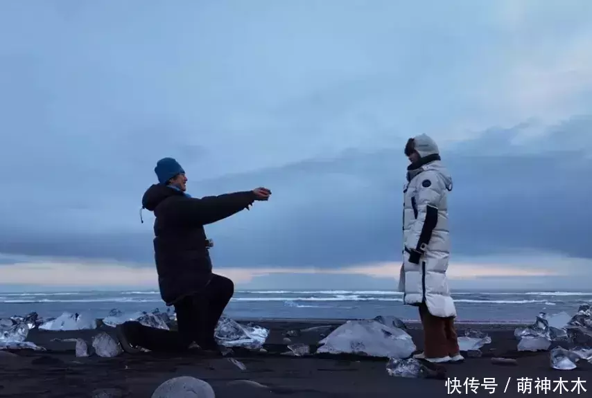 从两东谈主穿搭来看,这场求婚仍是比拟即兴,孙丞潇玄色羽绒服搭蓝色帽子,金莎银色羽绒服、灰色帽子搭红裤子,也算是“红蓝CP色”了。而他们采取的求婚场合也有好意思好的寓意,“钻石沙滩”记号爱情像钻石和冰川相同不朽。