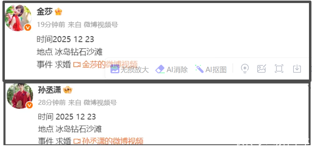 金莎跟孙丞潇传来好音问!金莎在微博晒了求婚画面,清晰孙丞潇在12月23日于冰岛的钻石沙滩完成求婚,随后孙丞潇也发微博官宣,激励热议。